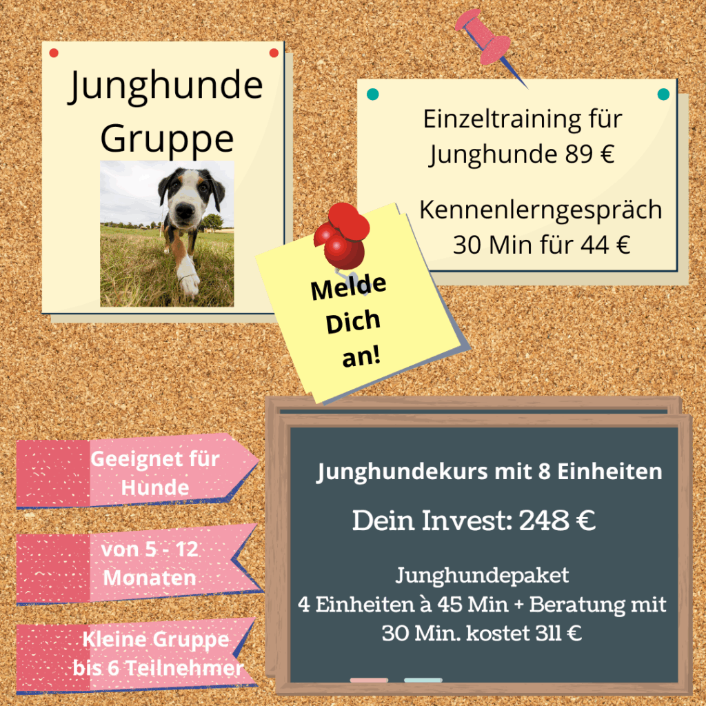 Die Junghundegruppe richtet sich an Hunde ab etwa 5 Monaten. In kleinen Gruppen mit bis zu 8 Teams üben wir alltagsrelevante Signale, Orientierung unter Ablenkung, Ruhe und natürlich den respektvollen Umgang mit anderen Hunden.